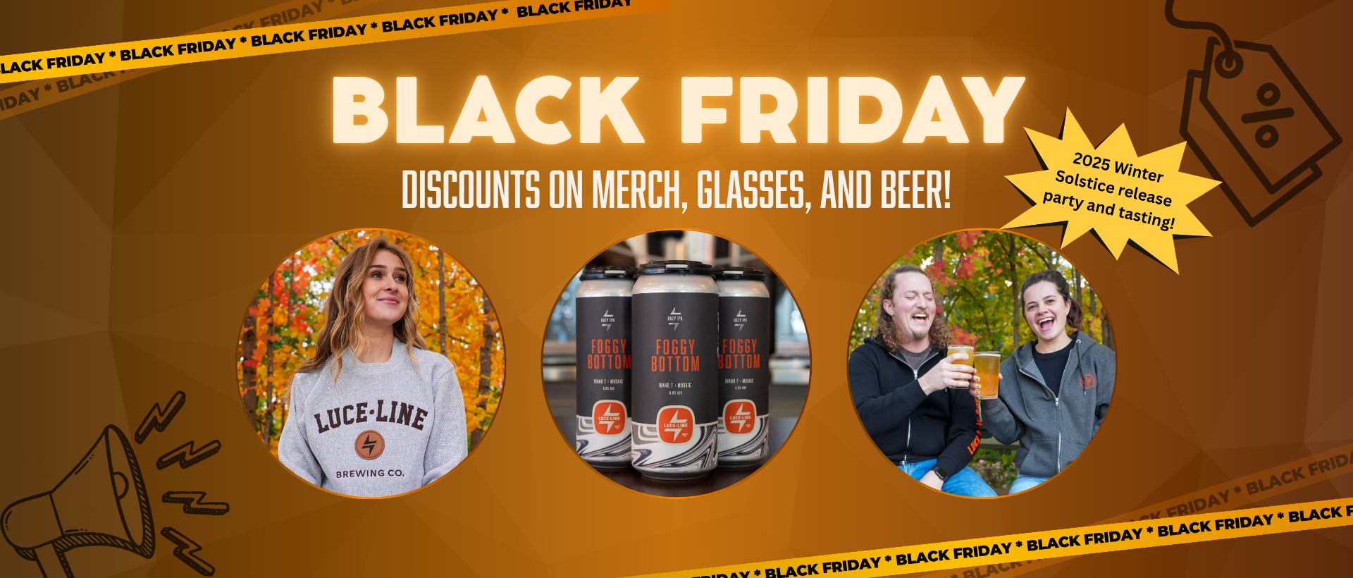 Get ready for the holidays and stock up with incredible savings on glassware, beer-to-go, and merch at Luce Line Brewing while also getting a first taste of our limited edition Winter Solstice. Specials kick off early during our 5th Beerthday party (11/15/25), with others starting Black Friday (11/28/25), and many of these great deals run all the way through December 24th. We’ll be open at 8am with coffee and brunch food to help fuel up your day of shopping.