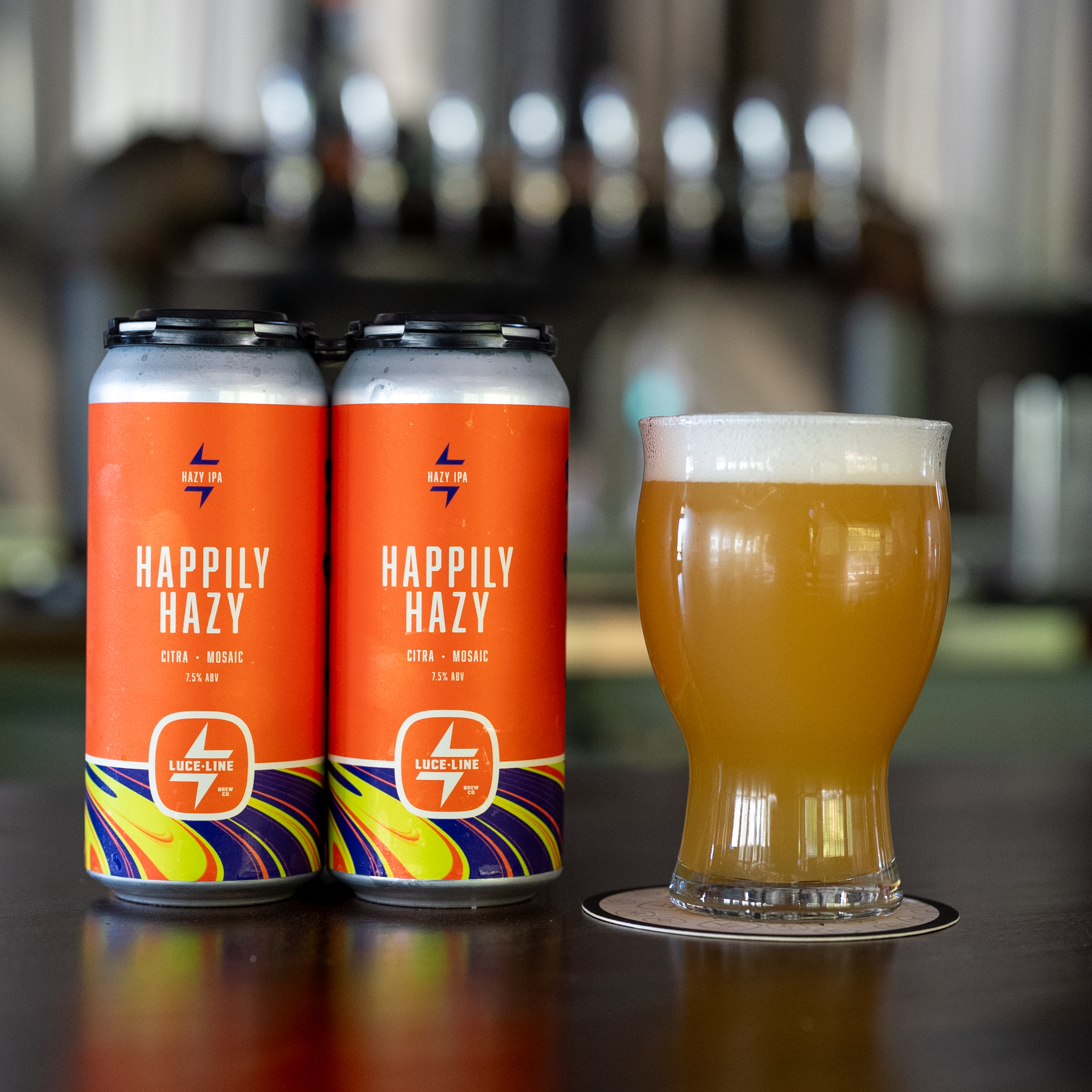 Happily Hazy is brewed with two of our favorite hops, Citra and Mosaic hops. We fermented the beer with our standard English Ale Yeast that provides a touch of sweetness along with subtle vanilla and citrus notes. As the beer finished fermentation, we dry hopped it twice with a blend of Citra, Citra Cryo (cryogenically processed version of Citra) and Mosaic hops to provide it with a big hop flavor consisting of overripe peach, berry, citrus, and subtle cotton candy.